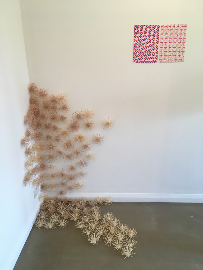 Camus’ practice developed from figurative painting into striking graphic works on paper. Swaying between systematic patterns and improvised gestures repeated endlessly, her work reflects on the act of making and the passing of time. Her recent practice retains the geometric simplicity and the repetitive rhythm of her earlier works while moving towards large scale installations using small sculptural arrangements and paper cut-outs. For Double Helix, Camus will turn her installation ‘ Ingress (sea urchins)’ into a durational performance. The installation will expand over the course of the exhibition as the artist continues to produce ‘sea urchins’ to cover as much space as possible during the shows’ opening hours.