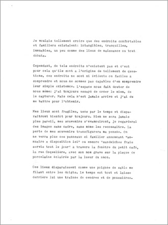 Series of translations of an extract from George Perec, Espèces d’Espaces (from French to English then English to French etc…), done by bilingual people successively.